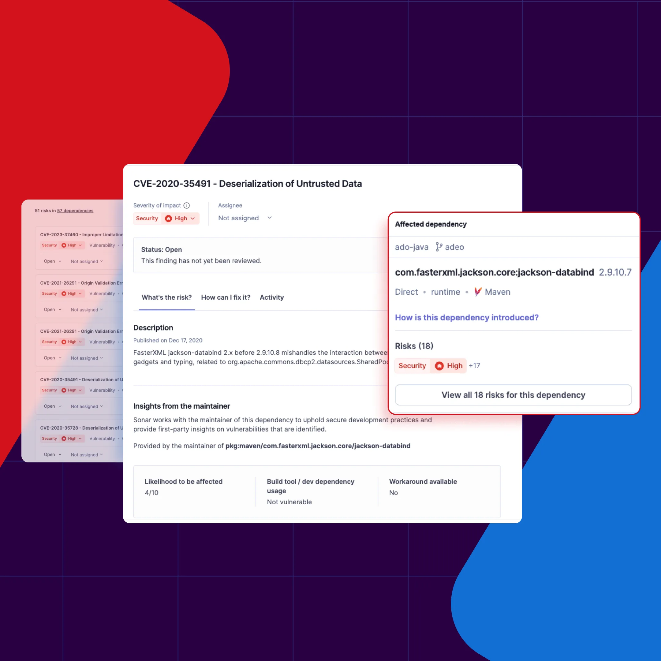 SonarQube Advanced Security provides deep visibility into your software supply chain through Software Composition Analysis (SCA). It analyzes your build configuration files (like pom.xml or build.gradle) and compares your dependencies against a comprehensive database of known vulnerabilities (CVEs).