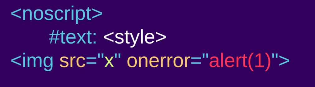 예를 들어 noscript 요소를 살펴보면, 해당 요소에 대한 파싱 규칙은 다음과 같습니다: “스크립팅 플래그가 활성화된 경우 토큰화기를 RAWTEXT 상태로 전환한다. 그렇지 않으면 토큰화기를 데이터 상태로 유지한다.” (링크) 즉, JavaScript가 비활성화되었는지 활성화되었는지에 따라 noscript 요소의 본문이 다르게 렌더링됩니다. JavaScript가 샌티라이저 단계에서는 활성화되지 않지만 렌더러에서는 활성화된다는 것은 논리적입니다. 이 동작은 정의상 잘못된 것은 아니지만 다음과 같은 우회를 유발할 수 있습니다: <noscript><style></noscript><img src=x onerror=”alert(1)”>