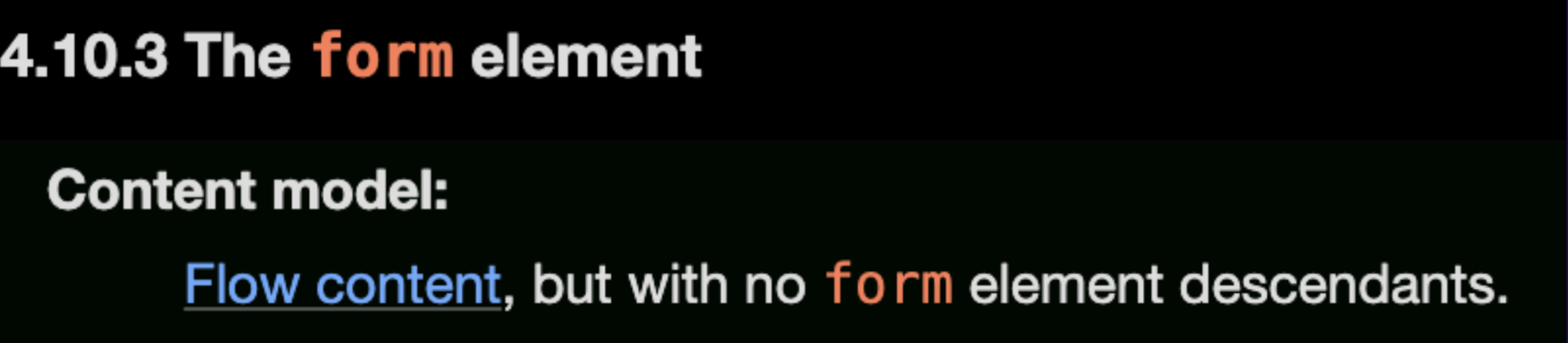 하지만 먼저, form 요소 내부에는 다른 form 요소가 중첩될 수 없다는 점을 이해해야 합니다: “콘텐츠 모델: 흐름 콘텐츠이지만, 하위 요소에 form 요소가 포함될 수 없음.” (사양서에 명시된 내용)