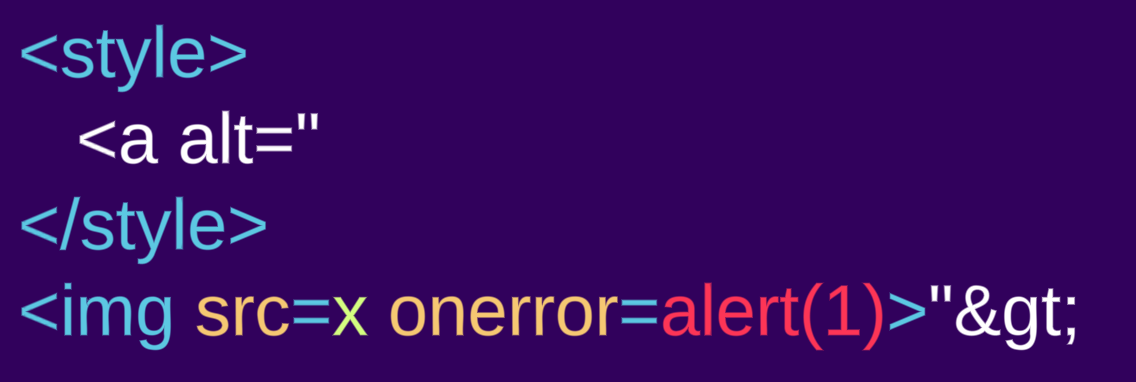style요소를 사용한 유사한 마크업입니다(이는 “원시 텍스트”입니다): <style><a alt="</style><img src=x onerror=alert(1)>">