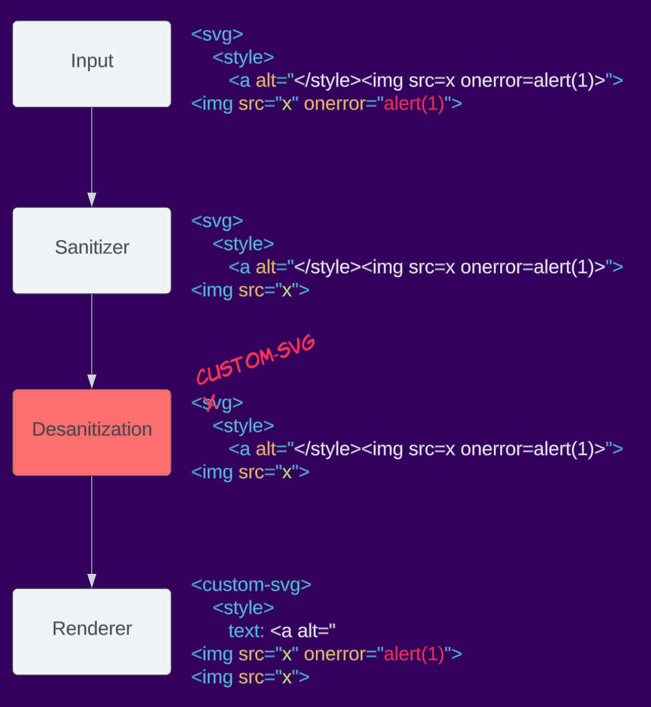 다음은 탈정화(desanitization)의 예시입니다. 애플리케이션이 정화기(sanitizer) 출력을 받아 svg 요소의 이름을 custom-svg로 변경하는 경우입니다. 이는 요소의 네임스페이스를 변경하여 재렌더링 시 XSS를 유발할 수 있습니다.