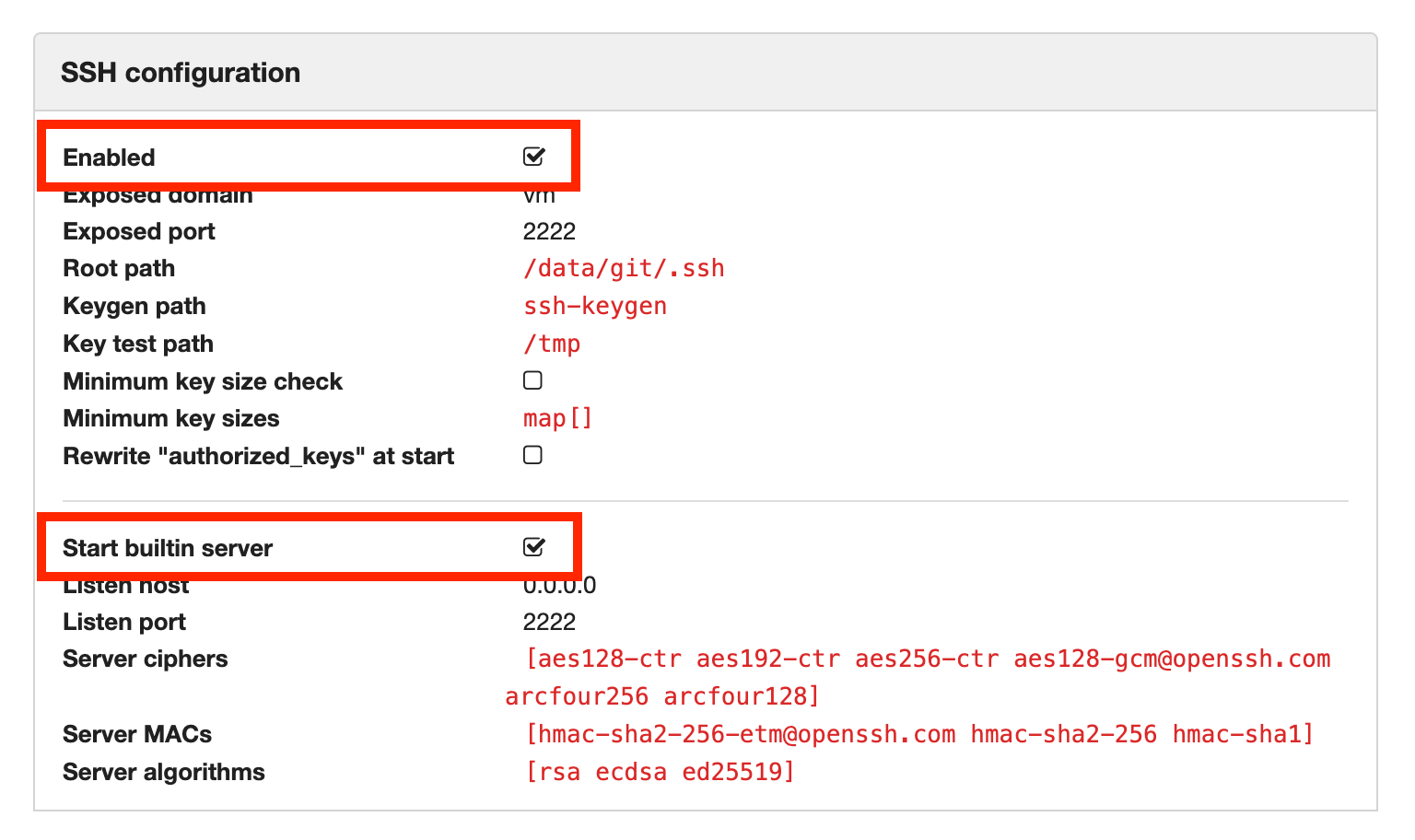 The requirements for a successful attack depend on the exact Gogs setup. For all Gogs instances, the built-in SSH server has to be enabled. You can check this by visiting the admin panel's configuration page (at /admin/config) and checking in the "SSH configuration" section if SSH is enabled and the built-in server is activated: