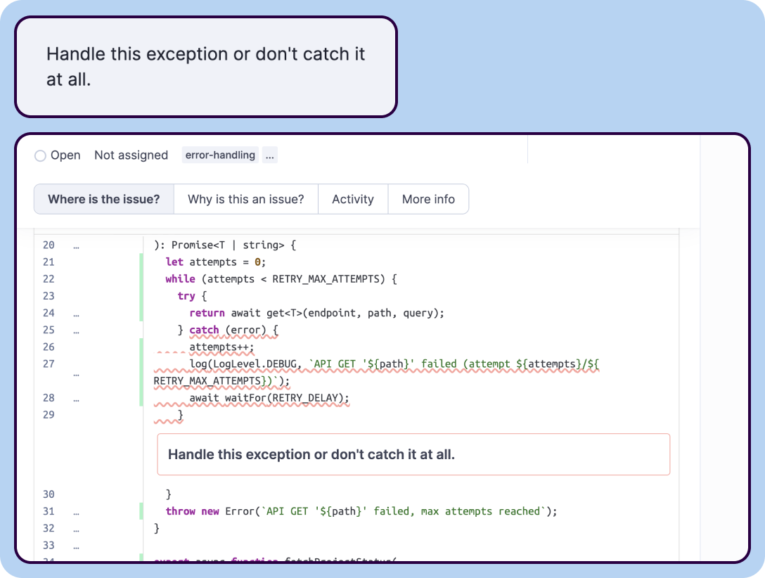 Security vulnerabilities require immediate action. Sonar provides detailed issue descriptions and code highlights that explain why your code is at risk. Just follow the guidance, check in a fix, and secure your application.