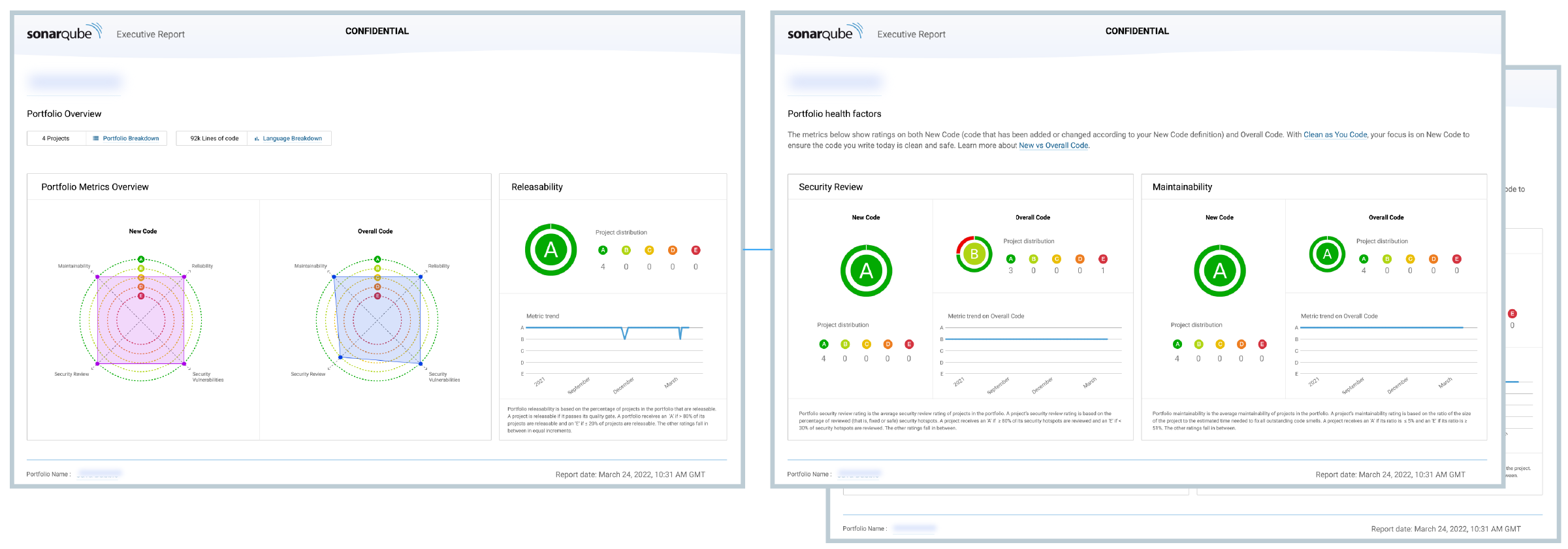 In SonarQube Server 9.3, the Clean as You Code method arrived in Enterprise Edition Portfolios. Now it's reflected throughout the Portfolio PDF as well. So the communication about New Code is consistent across the board: from project to Portfolio to PDF.