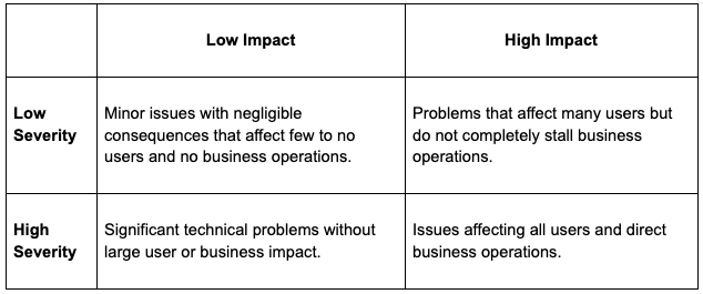 - Low Severity, Low Impact: Defer these for later; perhaps these never need to be addressed.