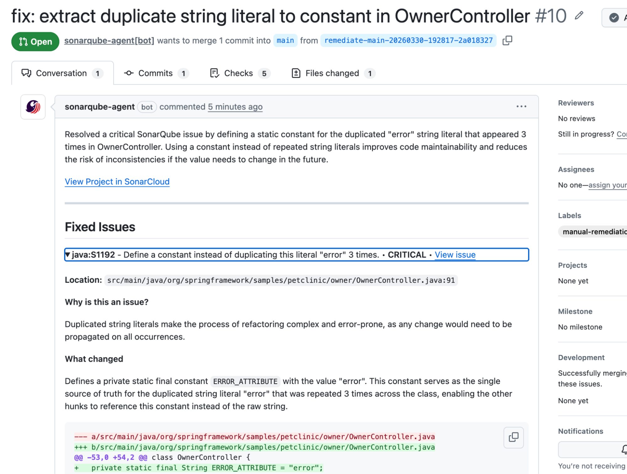 The S1192 fix is representative of what the agent produces. The original code duplicated the string "error" across three addFlashAttribute calls: