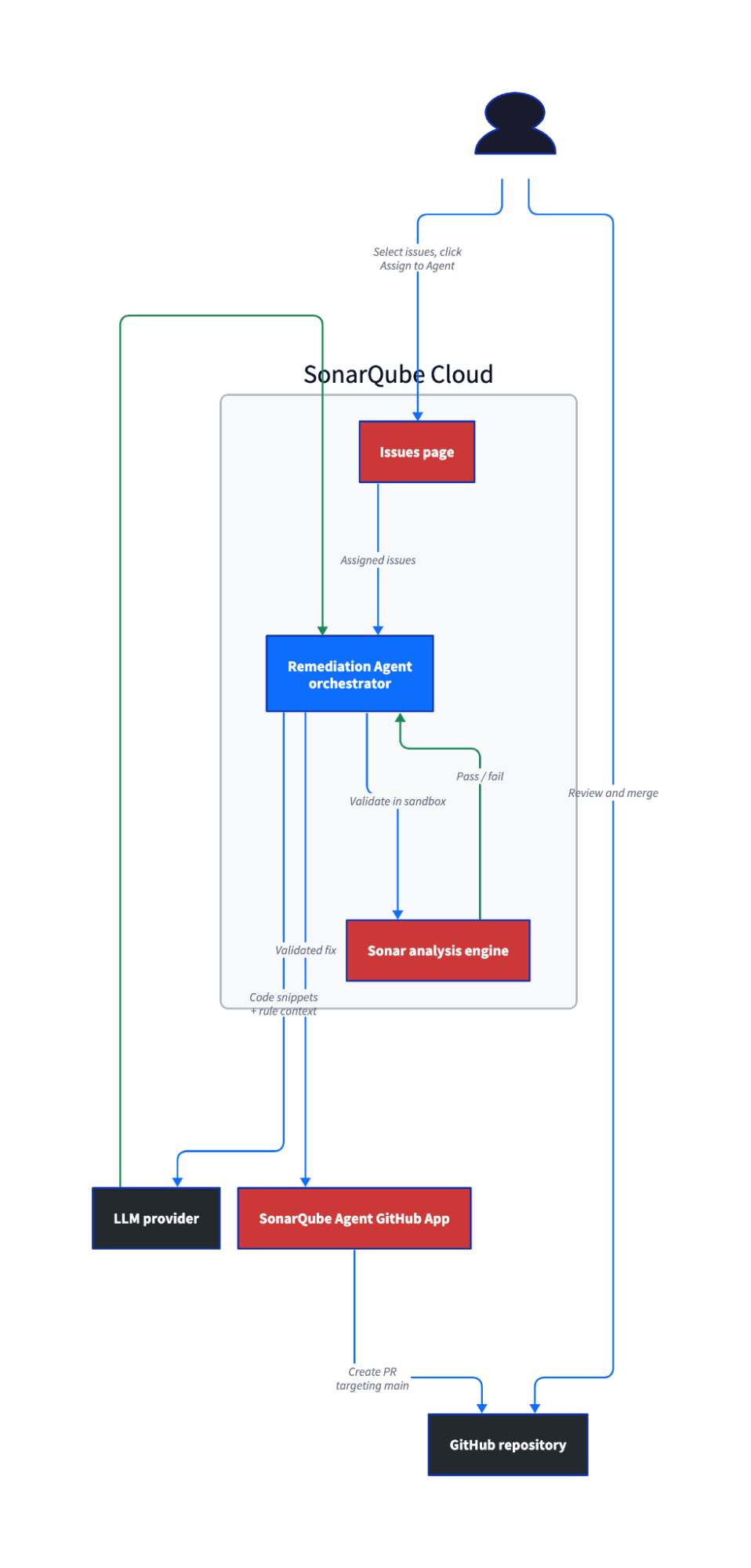 This blueprint covers the backlog fixing workflow only. It assumes you've already completed the companion blueprint, Fix pull request issues with the SonarQube Remediation Agent, which walks through installing the GitHub App and enabling the agent.