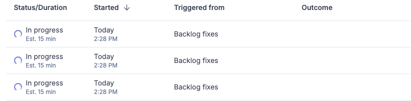 If you previously ran the PR workflow on the same project, both entry types appear on this page. The source label is how you tell them apart.