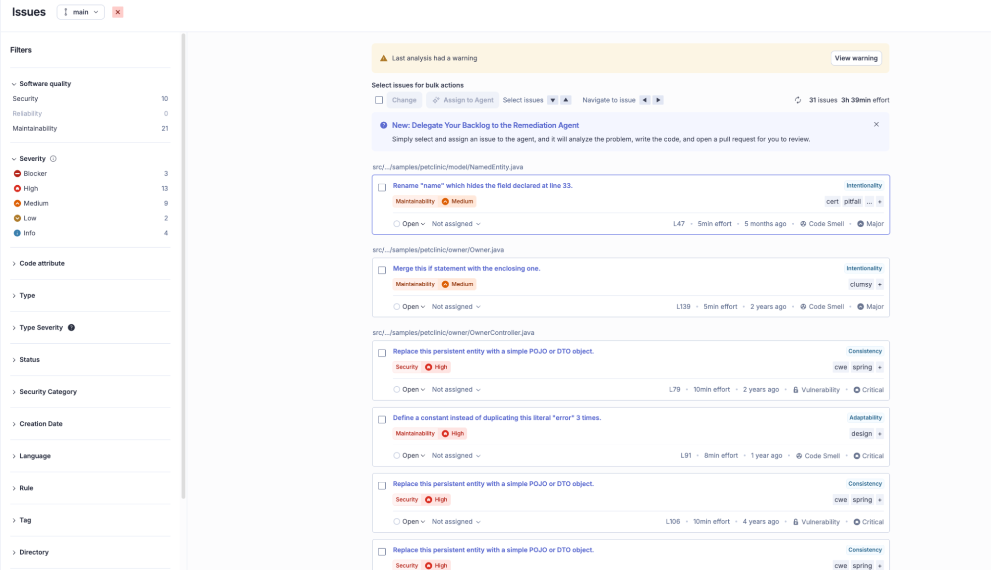 The Issues page lists every open issue on the branch, grouped by software quality and severity. Browse the list, as these are the backlog items you want the agent to work through.