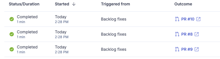 • Fix PRs target main. Every backlog fix PR targets the default branch directly. This is the intended behavior as the agent is fixing issues that already exist on main, so the fix goes back to main.
