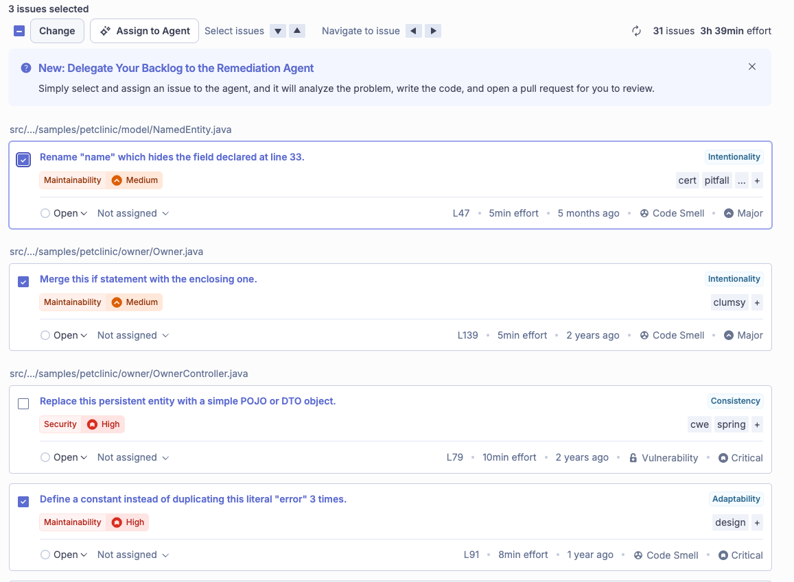 Use the checkboxes next to individual issues to select the ones you want the agent to fix. The Assign to Agent button in the toolbar above the issue list activates once at least one eligible issue is selected.