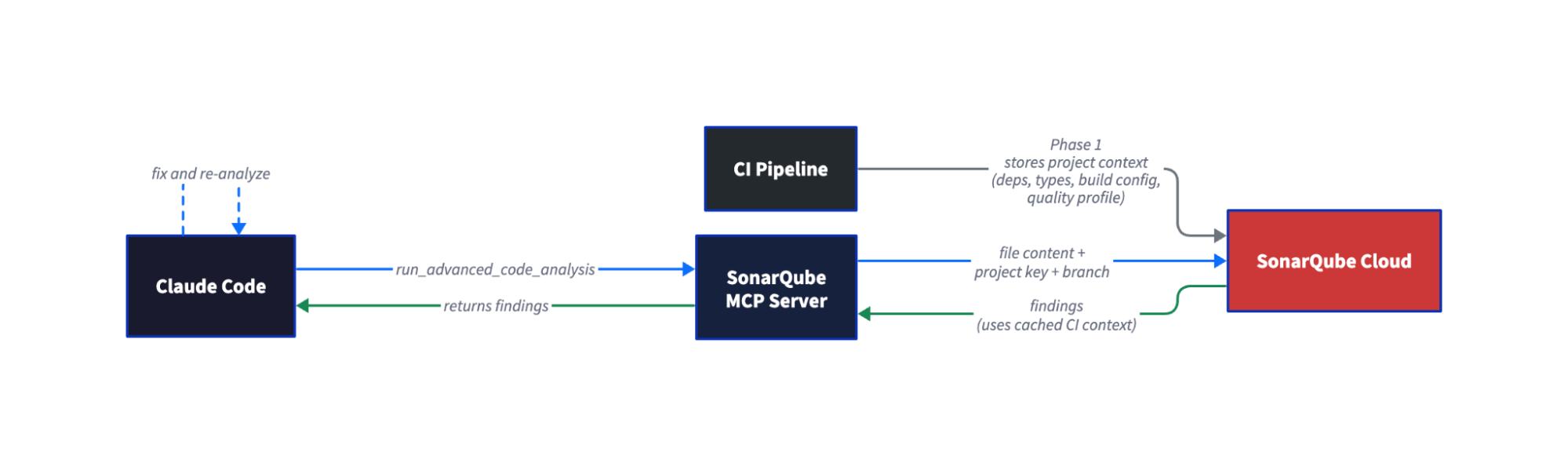 • The system uses an MCP Server to connect Claude Code with SonarQube Cloud’s remote engine, restoring cached CI context for high-accuracy results.
