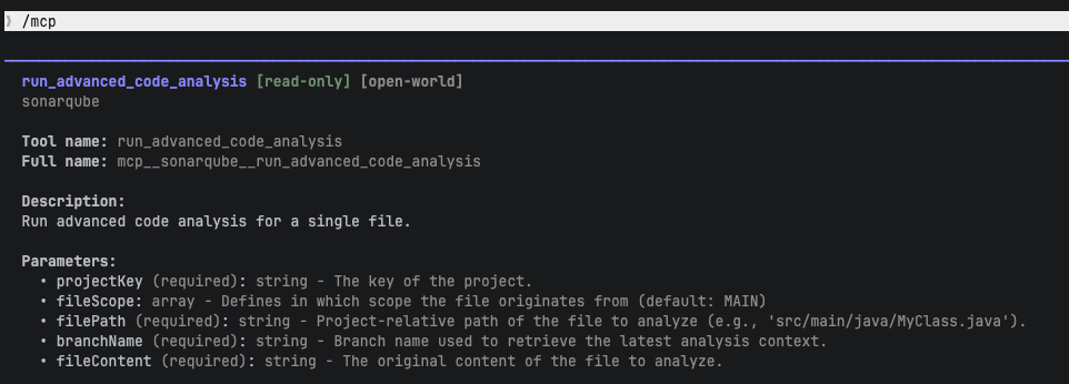 Verify the tool is available by typing /mcp in Claude Code. You should see run_advanced_code_analysis in the tool list with parameters: projectKey, branchName, filePath, fileContent, and fileScope.