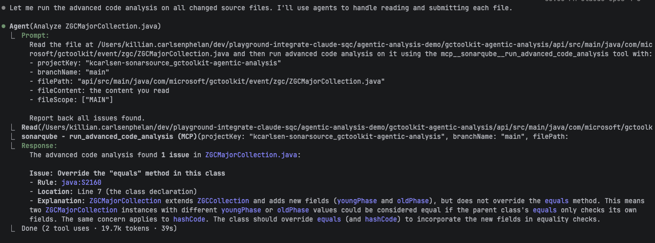 Agentic Analysis returns all findings in the analyzed file, not just issues introduced by recent changes. In our example, it also flagged 59 pre-existing issues across other files. Claude correctly distinguished the one new issue from pre-existing ones and prioritized the code it had just written. Claude also analyzed four other changed files in parallel. Analyzing a single file took approximately 39 seconds; response time depends on file size and the project's analysis configuration.