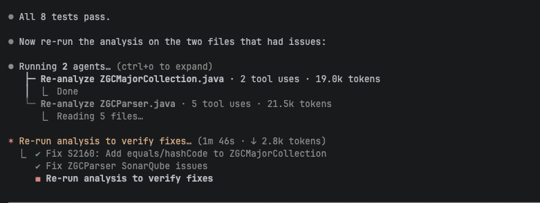 Ask Claude to analyze a file after generating or modifying code. In our example, we asked Claude to extend a Java parser module and then prompted: