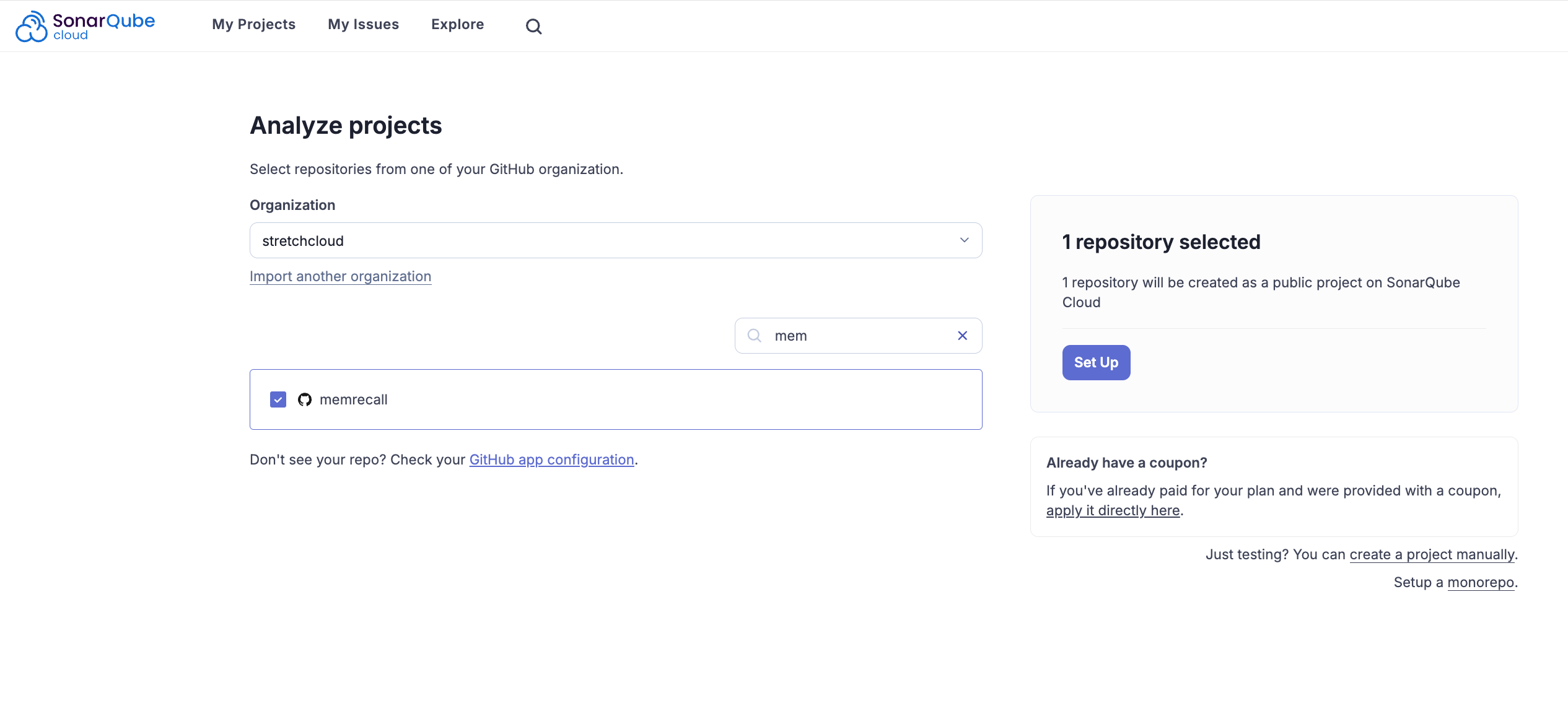 Select the GitHub repository where you want to install SonarQubeCloud.