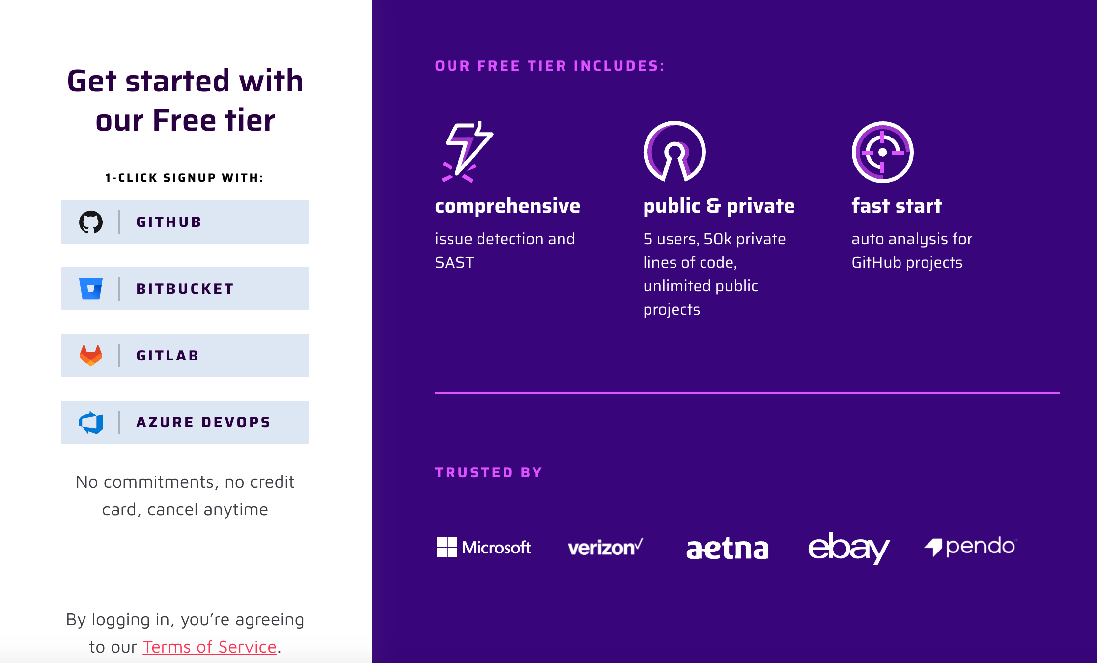 SonarQube Cloud integrates seamlessly with popular version control platforms. You can sign up using your GitHub, GitLab, Bitbucket , or Azure DevOps account.
