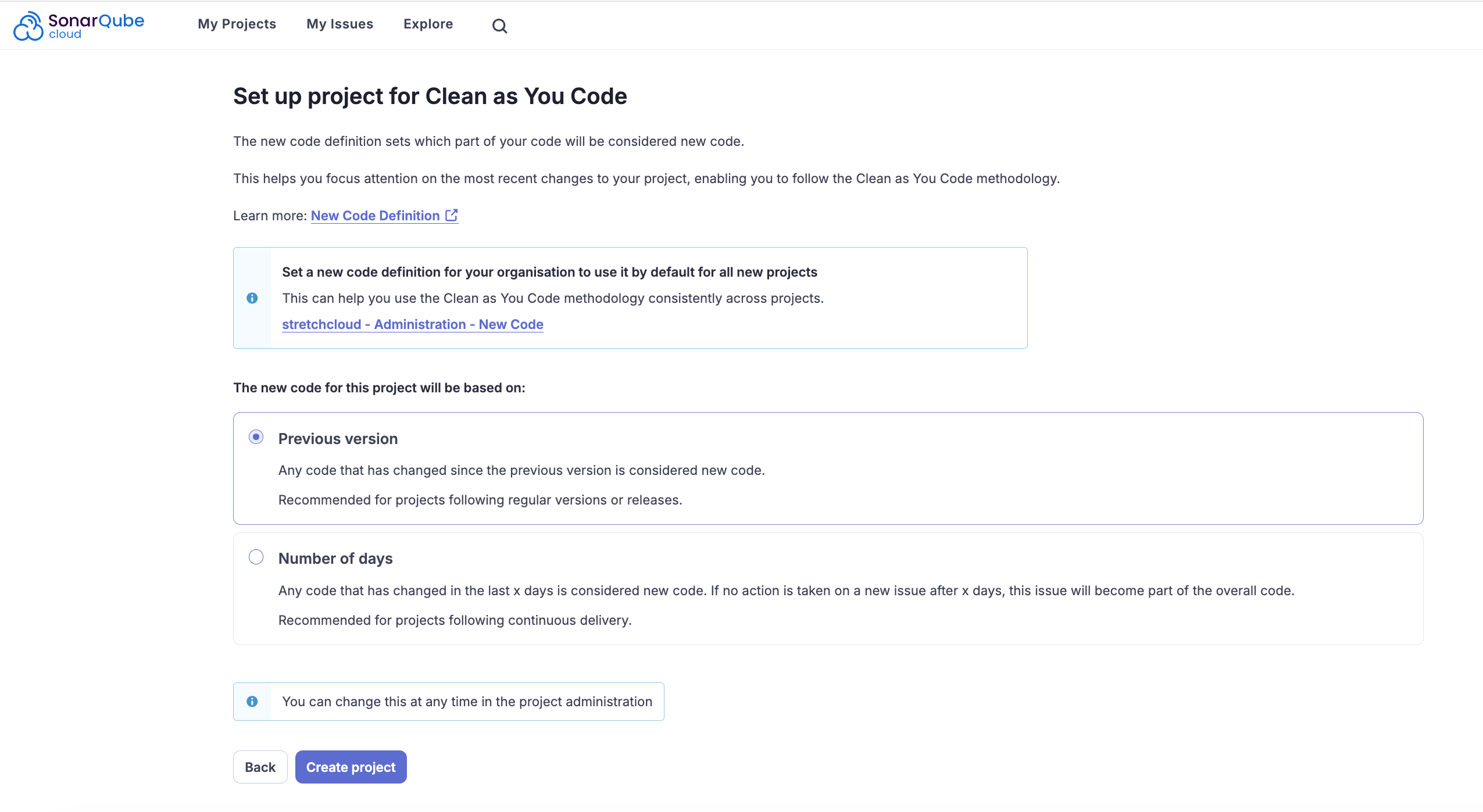 On the “Set up project for Clean as You Code” page, you need to set the new code definition.