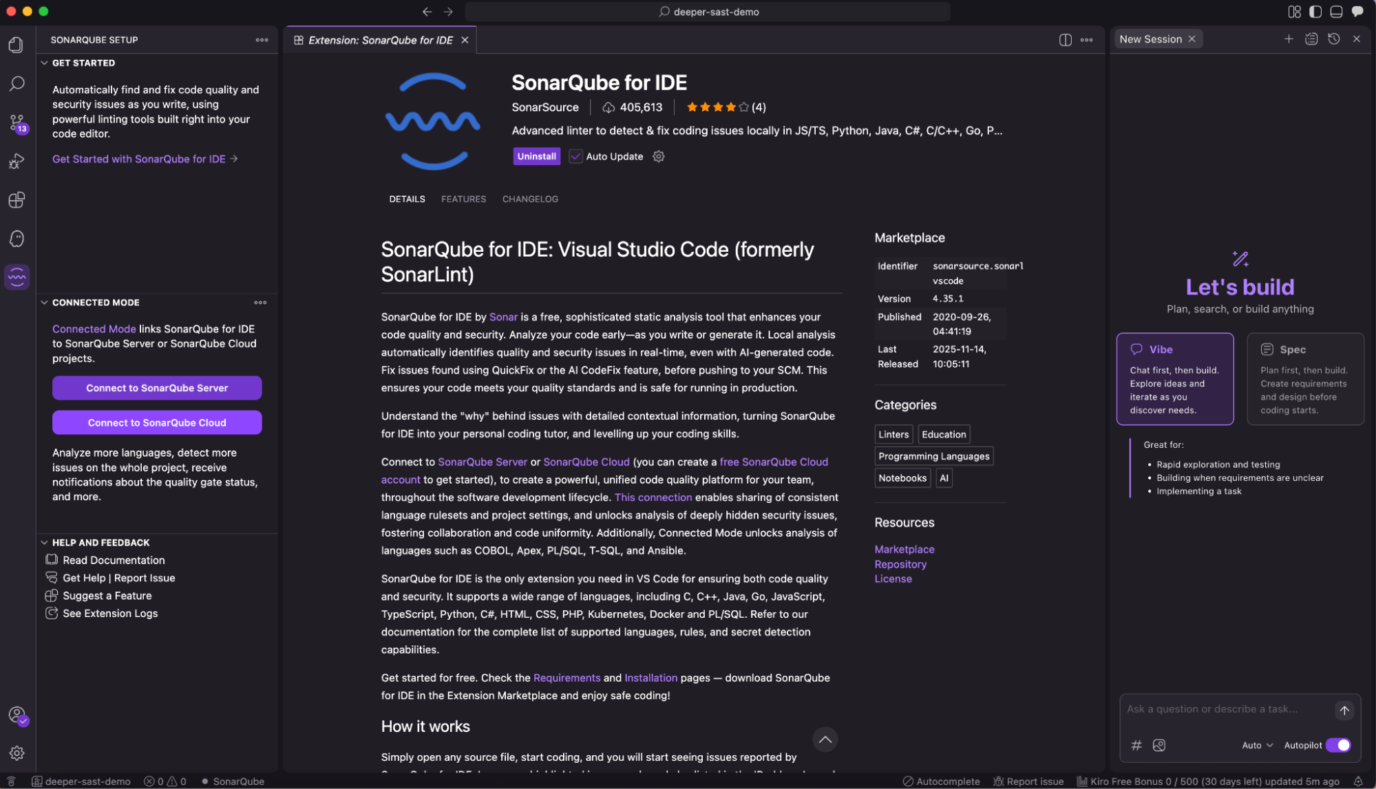 While the standalone extension provides great value, connecting Kiro to SonarQube Cloud (“Connected Mode”) unlocks the full potential of the tool.