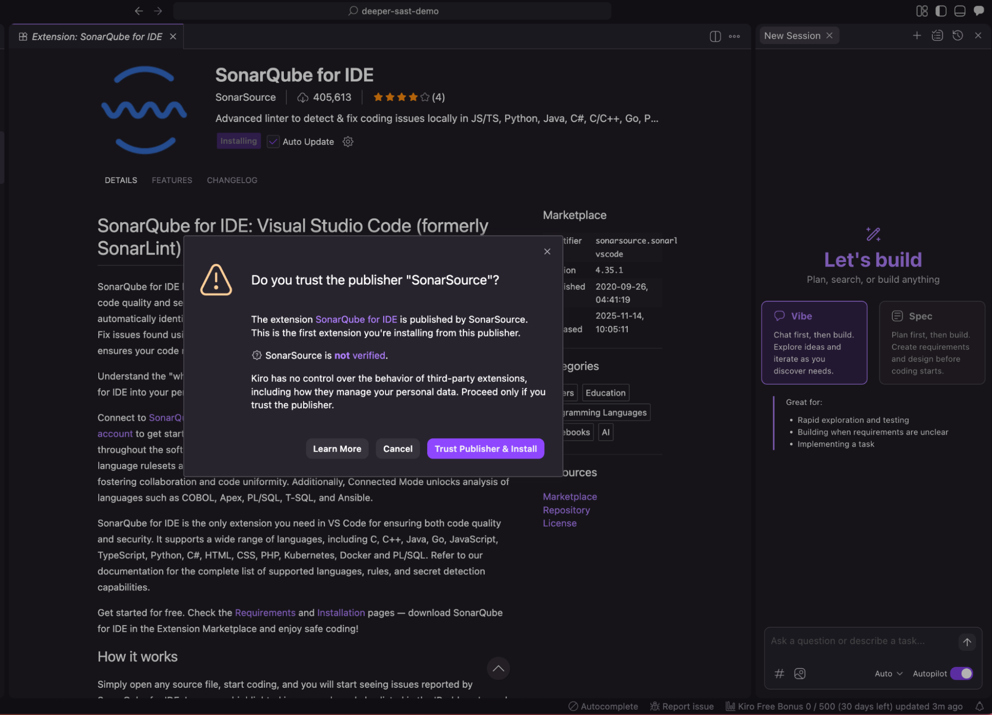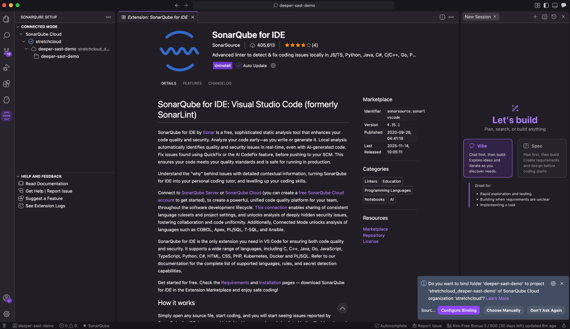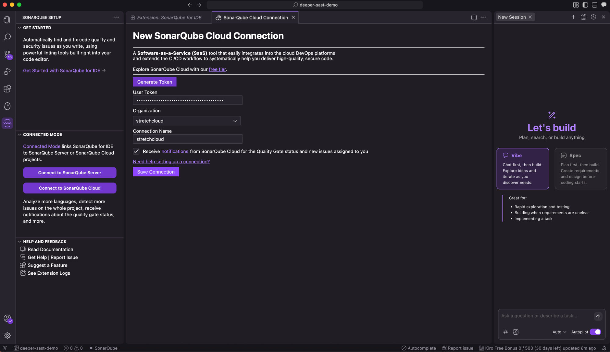 While the standalone extension provides great value, connecting Kiro to SonarQube Cloud (“Connected Mode”) unlocks the full potential of the tool.