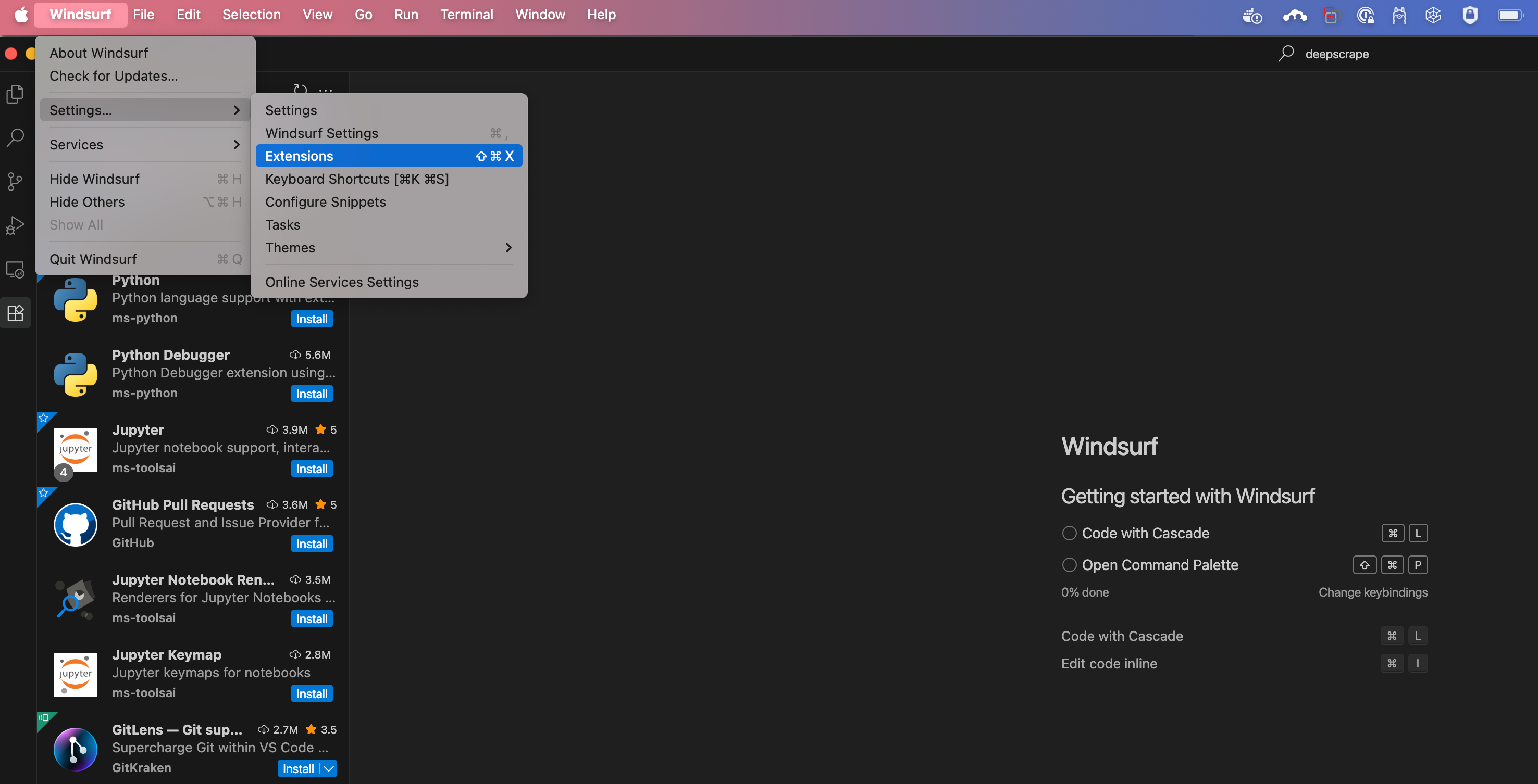 • Navigate to the extension dialog. To do this, click on the Windsurf menu, then Settings and click on Extensions.