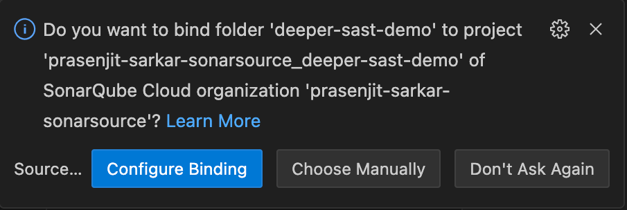 - Bind the project: Search for and select SonarQube for IDE: Configure Project Binding.