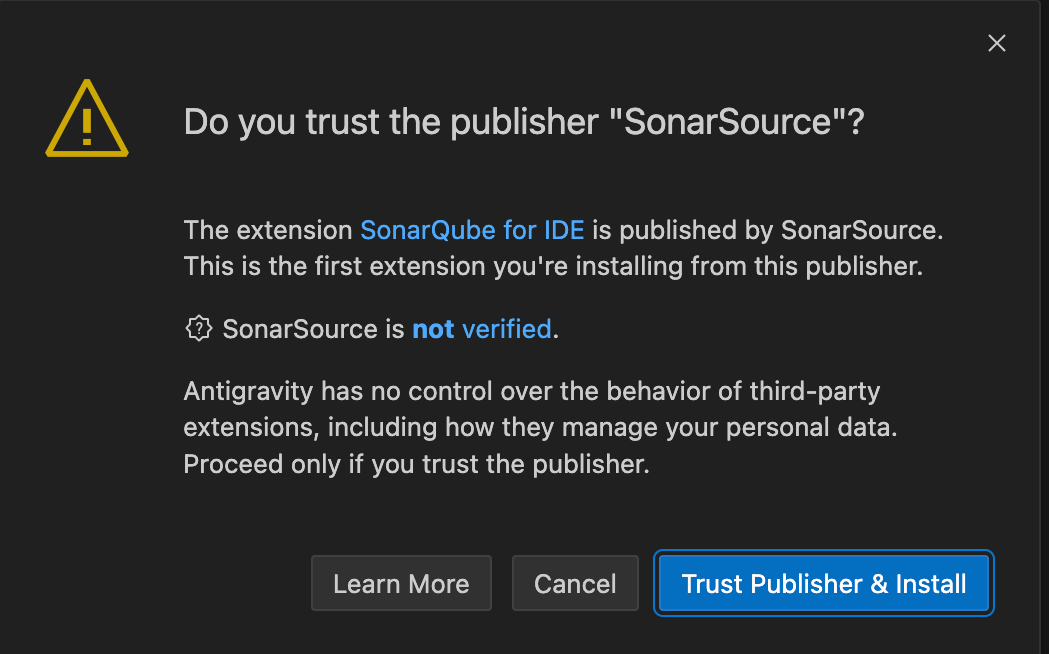 Google Antigravity is built on the same open-source foundation as VS Code, but it utilizes the OpenVSX registry instead of the Microsoft Marketplace. SonarQube for IDE is fully published and supported on OpenVSX.