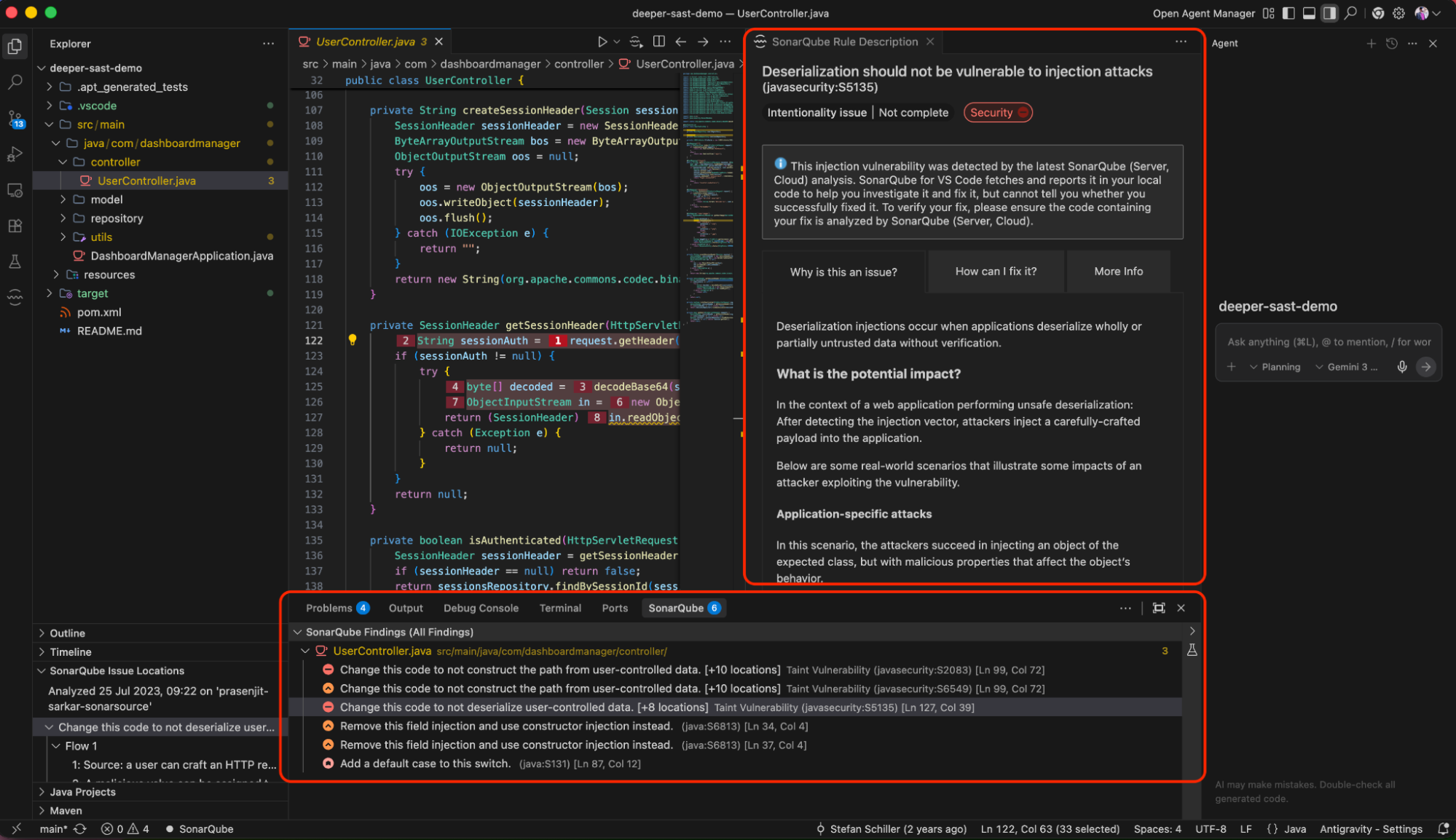 - Detection: As the agent writes the file, SonarQube for IDE detects a security hotspot (e.g., using a weak hashing algorithm).