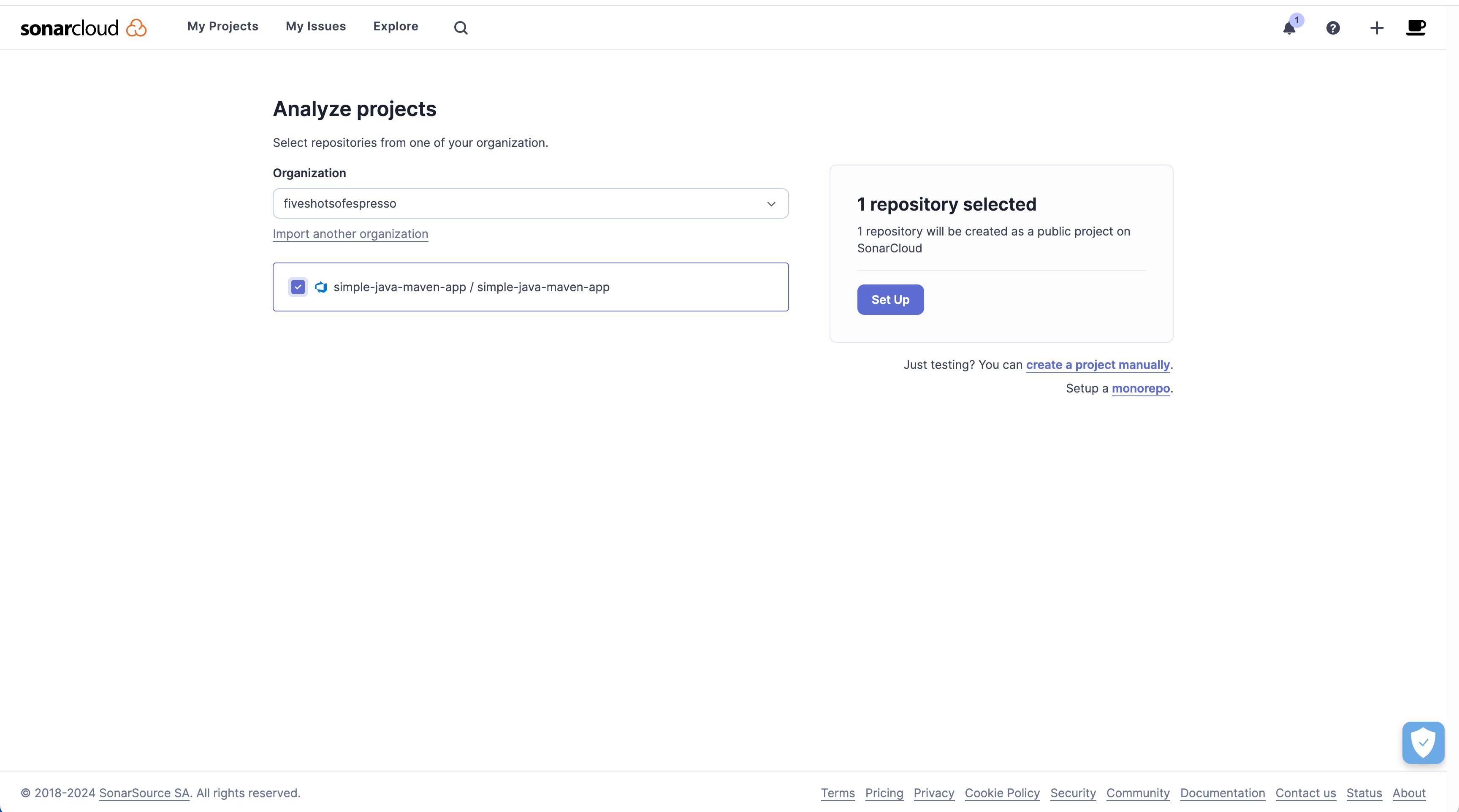 - Scanning your first project is as simple as clicking Set Up. SonarQube Cloud’s automatic analysis doesn’t require configuration so you can begin scanning immediately.