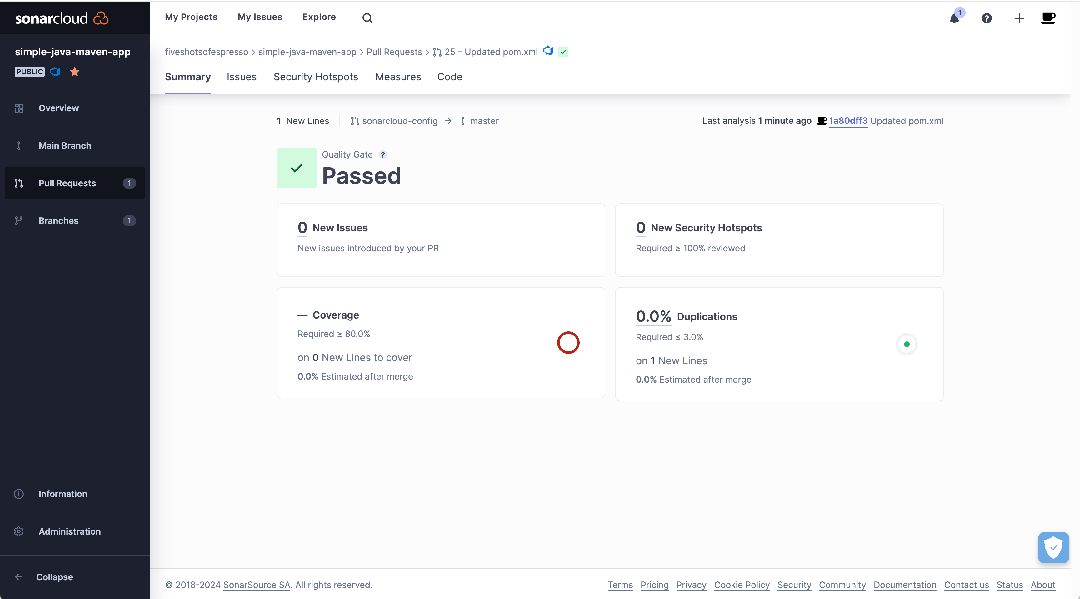 - SonarQube Cloud will return a dashboard showing your code's health status, including issues related to reliability, security, maintainability, and more.
