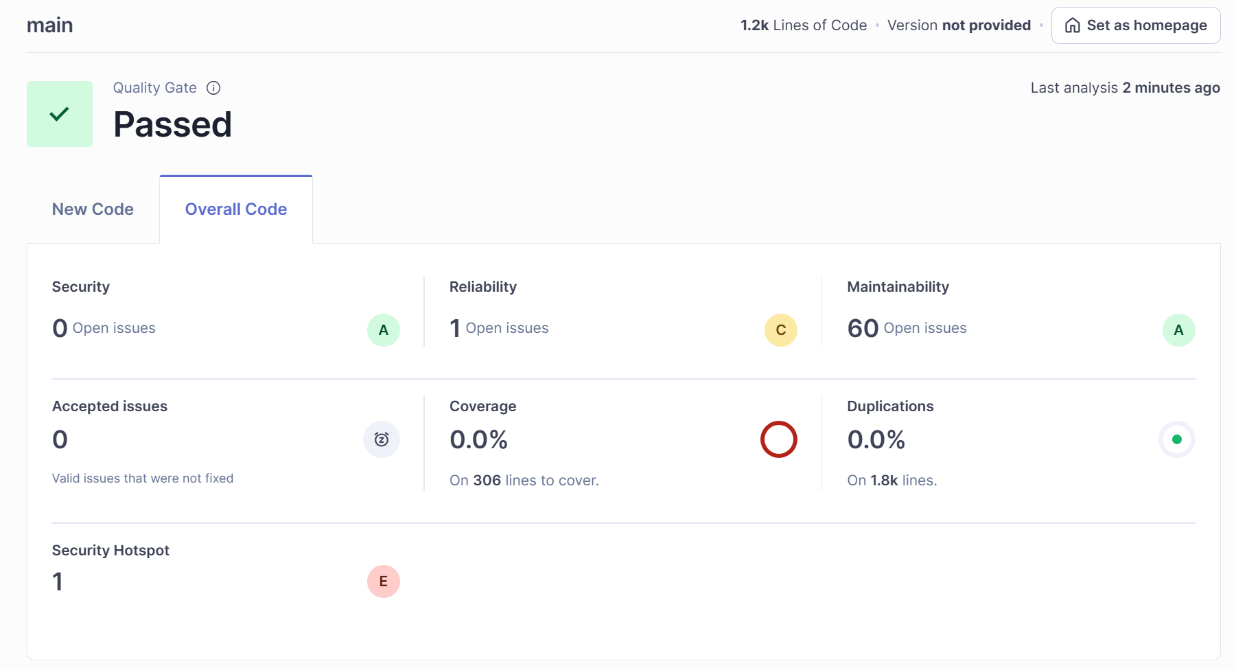 • New Code Definition: By default, the dashboard focuses on issues introduced in recent changes (New Code), helping teams prevent technical debt from growing without getting overwhelmed by legacy issues.