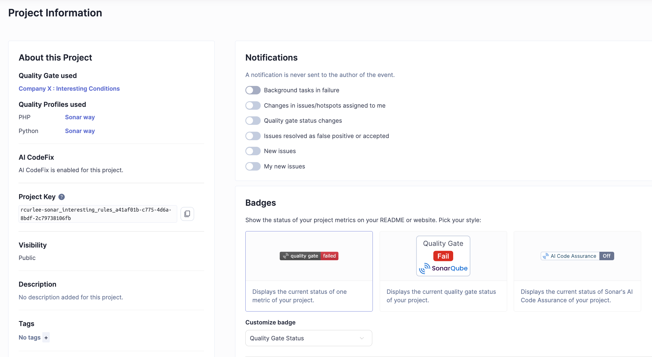SonarQube is a powerful tool for integrated code quality and code security that continuously analyzes and reviews your code as you develop to ensure all code, both AI-generated and human written, meets the highest standards. It provides detailed analysis and metrics on various aspects of your codebase, and crucially, it offers badges that can be readily integrated into your README.md files and DevSecOps dashboards.