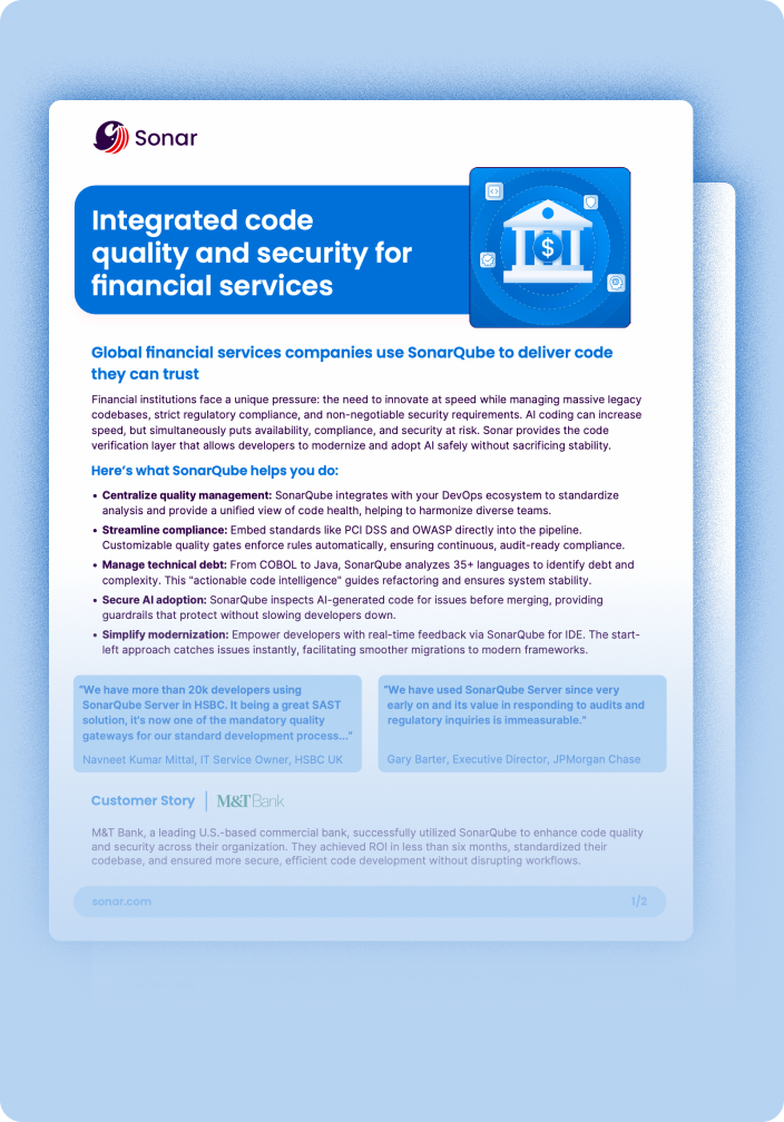 Financial institutions face a unique pressure: the need to innovate at speed while managing massive legacy codebases, strict regulatory compliance, and non-negotiable security requirements. AI coding can increase speed, but simultaneously puts availability, compliance, and security at risk. Sonar provides the code verification layer that allows developers to modernize and adopt AI safely without sacrificing stability.