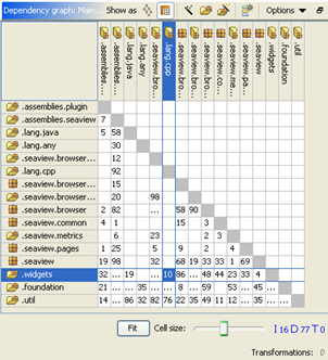 2. A number in a cell indicates the number of references from the column item to the row item (in the example, "util" uses "views" 8 times). (The numbers are the same as the number on the dependency edge in the equivalent diagram).