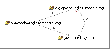Dependencies (indicated by arrows) may be due to a direct relationship between 2 components, such as one class extending another. Alternatively, they may be due to relationships between items contained by the 2 components, for example a method contained by one class invoking a method contained by another causes a dependency between the 2 classes. The number next to the arrow is the total number of references between the 2 dependent components.