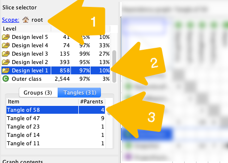 The Slice perspective is particularly valuable for understanding tangles. For example, some design tangles are caused by a large class-level tangle. Others may be caused just by the way in which classes or packages are organized. The Slice perspective helps you figure out which it is.