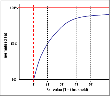 As an example, consider Fat for methods with a threshold of 15 (paths). Clearly a value less than or equal to the threshold will evaluate to 0% excess complexity, which is exactly as desired.