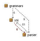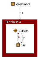 )" - a minimum number of edges which would have to be removed in order to leave the graph acyclic (no longer tangled). Structure101 Studio colors the edges in the mfs red (e.g. xni to parser above).