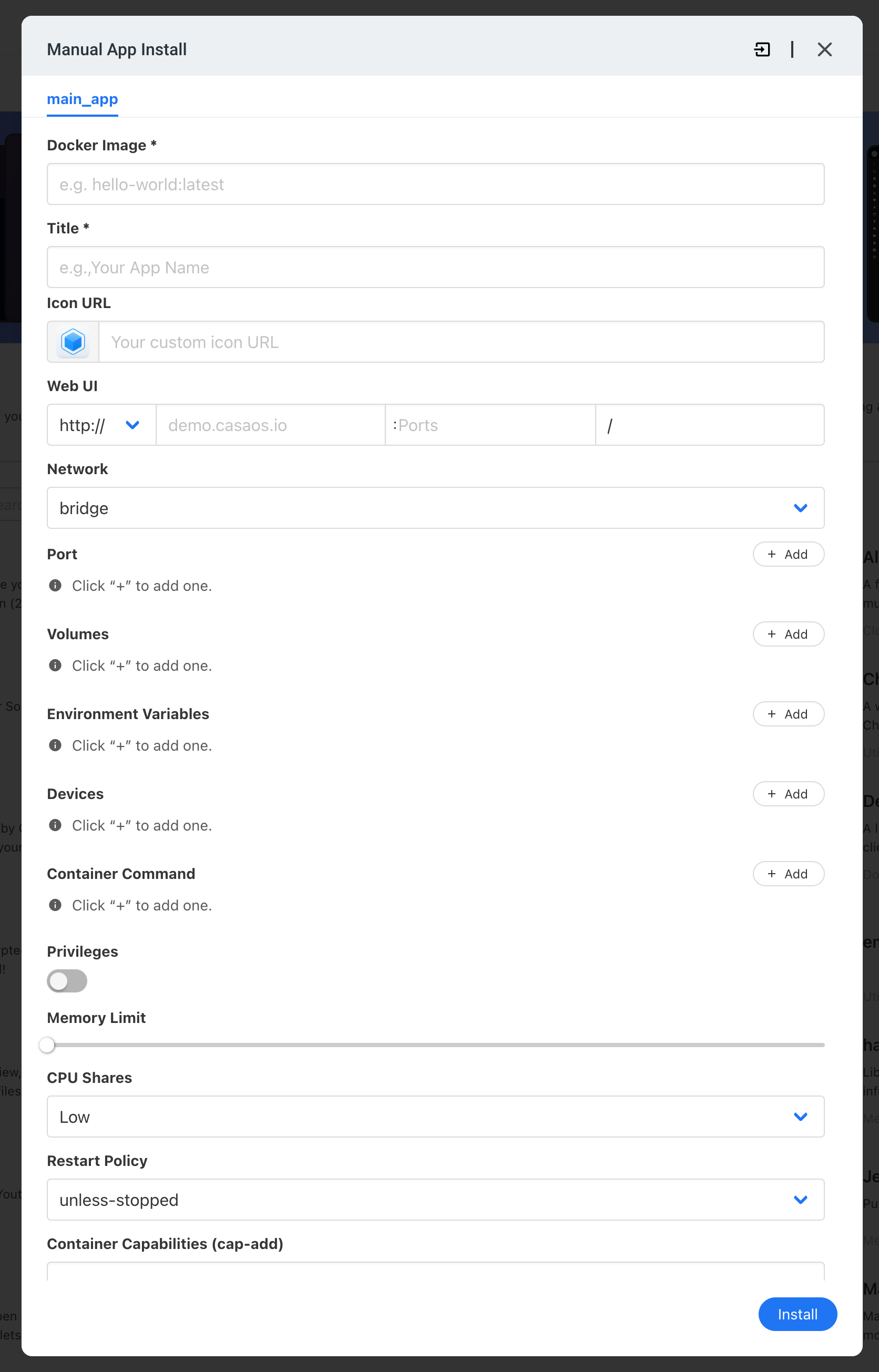 One of the most appealing features of CasaOS is its support of third-party applications through the internal application store or manually through the web interface and their Custom Install wizard.