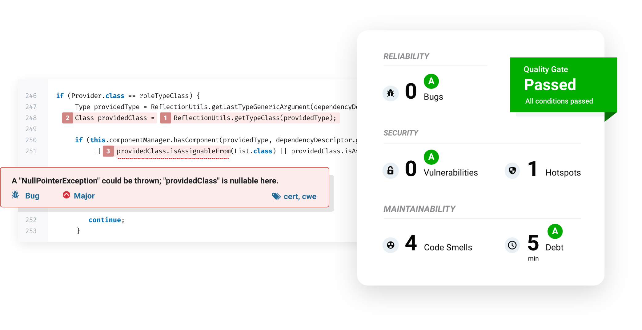 Own the quality of your team's code. New or changed code doesn’t get merged unless it passes the Quality Gate.