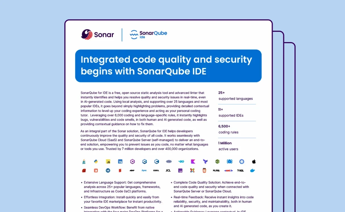 SonarQube for IDE is a free, open source IDE extension that provides developers with immediate coding feedback before they commit code while helping them understand why an issue is raised, what is at stake, and how to fix it.